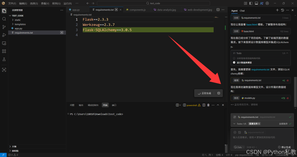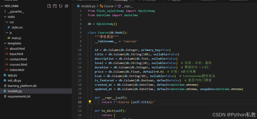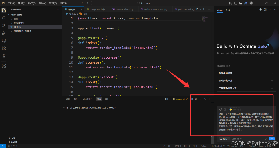 现在已经有了 Flask(使用 Python 作为后端编程语言),作为一个网站,怎么能没有数据库呢?继续让 Comate 优化项目,采用 SQLAlchemy 作为数据库交互框架,为项目增加数据库功能。提示词如下: