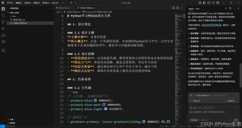 接下来,让 Comate 充当 UI 设计师角色,设计 UI 界面并编写 UI 设计文档,提示词如下: