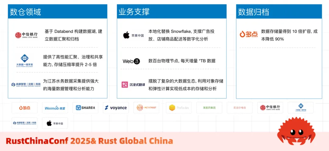 在商业产品的竞争中,技术选择必须经得起市场检验。经过四年的发展,Databend 用实际的生产环境验证证明了 Rust 的商业价值。在金融领域,中信银行基于 Databend 构建数据仓库服务,代表了传统金融机构对新技术的认可。在政务领域,福建省大数据中心将 Databend 完全集成到省级大数据平台中,包括统一查询接口和存储服务,通过底层压缩优化实现了相比原有方案 2-5 倍的存储效率提升。