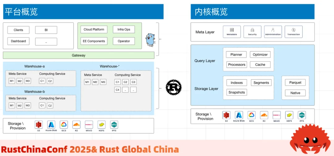 核心计算层完全基于 Rust 实现,包括 Meta Service 和计算 Service 两个关键组件,这部分代码完全开源。Meta Service 负责数据库表管理、权限控制、事务处理等功能,基于团队自研的 OpenRaft 项目构建。计算层包括查询引擎和存储引擎,从零开始开发,功能设计参考了 ClickHouse 等成熟产品的架构理念。