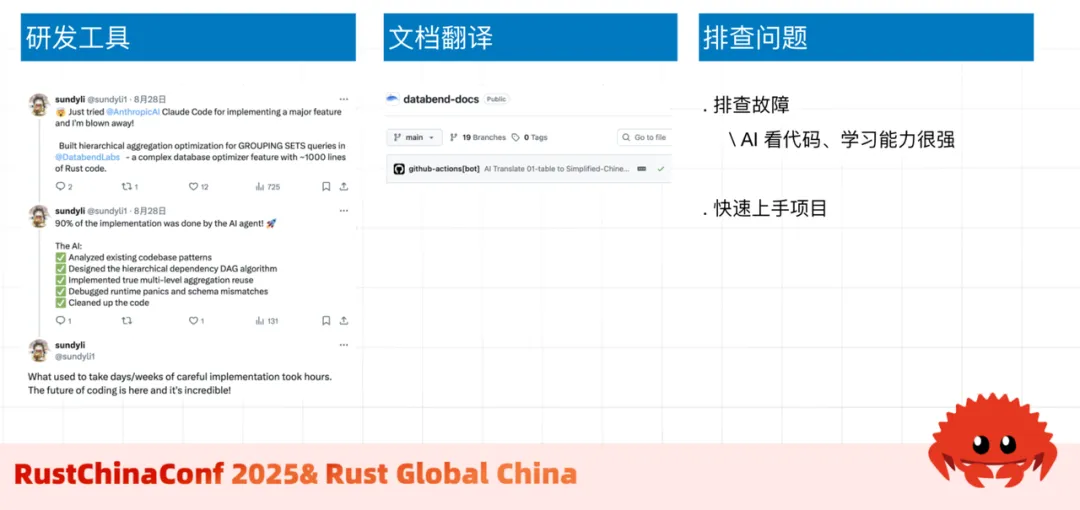 在 AI 技术快速发展的背景下,Databend 积极探索 AI 在研发流程和产品功能中的应用。从研发效率角度来看,AI 工具已能够生成高质量的 Rust 代码和测试用例,这标志着 AI 对 Rust 语言理解能力的显著提升。相比早期只能生成表面正确但实际无法运行的代码,现在的 AI 生成代码不仅能够编译通过,还能满足 Rust 严格的借用检查要求。