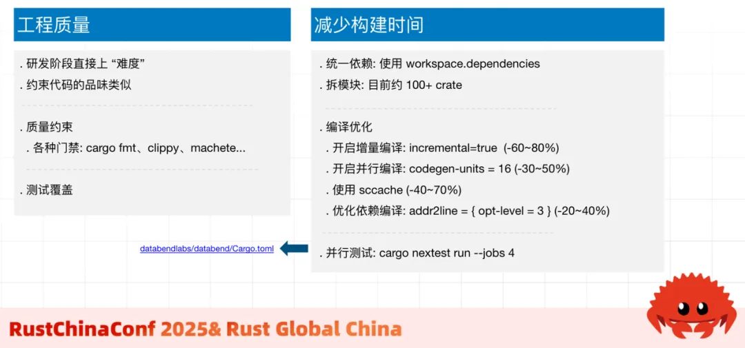 首先是依赖管理的统一化。通过 workspace 机制统一管理所有依赖及其版本,避免了循环依赖和版本冲突问题。其次是模块化拆分,将项目拆分为 100+ 个子模块,充分利用 Rust 的增量编译特性,避免不必要的重新编译。