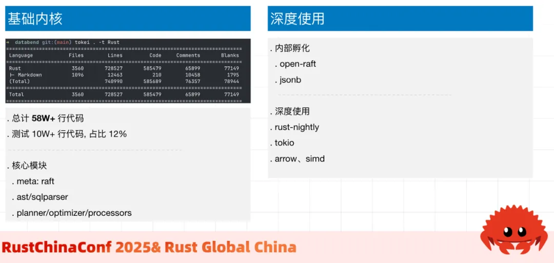 目前 Databend 的 Rust 代码规模已达到 58 万行,测试代码占比约 12%。这一代码规模在全球 Rust 开源项目中位居前列。核心模块包括 Raft 协议实现和完整的计算引擎,全部从零开始开发,功能设计借鉴了 ClickHouse 等成熟产品的技术理念。