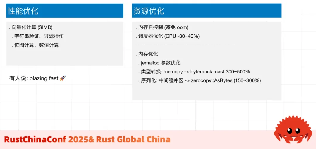 这些性能提升体现了 Rust 语言特性与精心优化的系统设计的完美结合,也验证了"高性能且安全"这一 Rust 核心价值主张在实际应用中的实现。