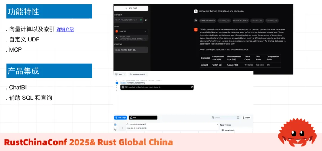 在刚刚结束的 RustChinaConf 2025 杭州大会上,Databend 技术 VP 陈小玉的主题演讲《基于 Rust 构建商业化数仓平台的探索》引起了与会者广泛关注。作为 Rust 商业化浪潮中最具代表性的实践者,Databend 用四年半的时间证明了 Rust 在企业级产品中的巨大潜力。