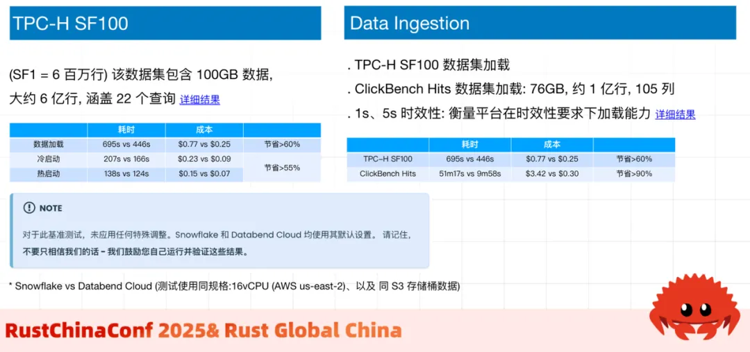 为了验证性能优势,团队在官网公开了详细的基准测试数据,并承诺在每个版本发布时更新对比结果。测试包括两个主要场景:TPC-H 基准测试和数据加载性能测试。