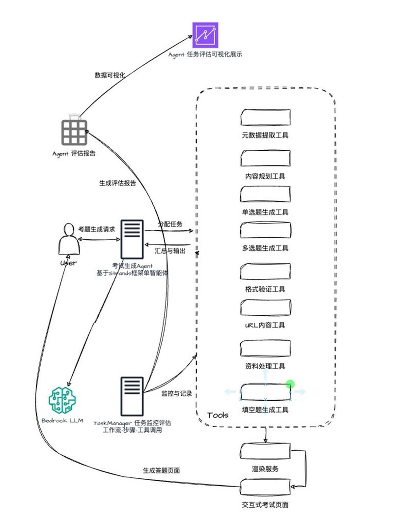 本项目基于 Strands Agent 框架的 AI 考试生成器项目成功实现了从传统手工出题到智能化自动生成的转变,将考试生成时间从小时级压缩至分钟级。项目在技术上将 Strands Agent 框架应用于教育领域,构建了完整的 8 种工具函数生成链,同时也设计了 TaskManager 任务评估体系,通过”工作流-步骤-工具调用”三层次架构实现了对 Agent 执行过程的全方位监控管理,实现了多工具协同场景下的状态跟踪和性能评估。并结合 QuickSight 可视化分析平台,将 Agent 执行数据转化为直观的性能报告和优化建议,为复杂 AI 系统的可观测性和可维护性提供了完整解决方案。