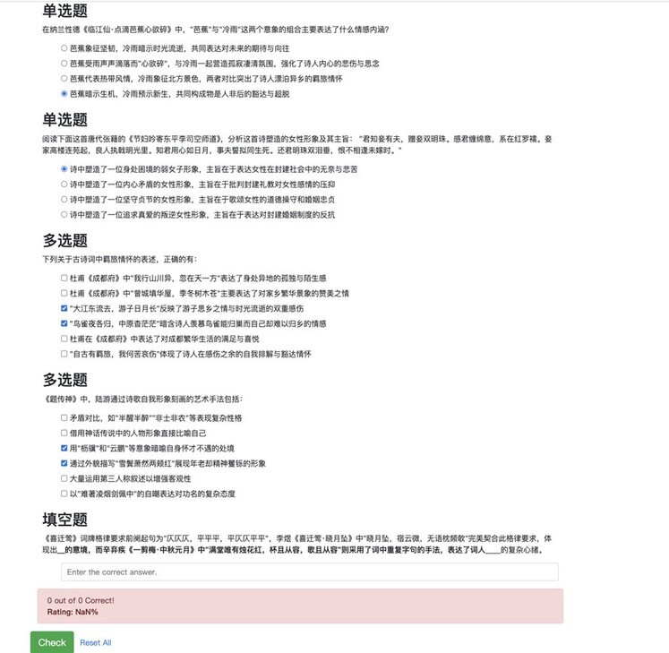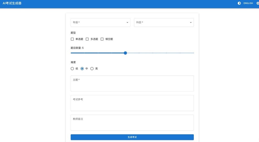 生成的考试内容会渲染为交互式 HTML 页面,支持选择、填空等交互操作,界面美观易用;还支持中英文双语界面,可生成不同语言的考题。