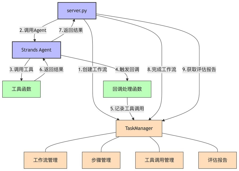 Agent 执行评估工作流(Taskmanager)是基于 Strands Agent 框架的回调机制构建、负责工作流与工具调用的状态监控和管理。回调机制提供的事件监听接口允许 TaskManager 捕获 Agent 运行过程中的状态变更事件,特别是工具调用的执行状态转换。TaskManager 实现了以下核心功能: