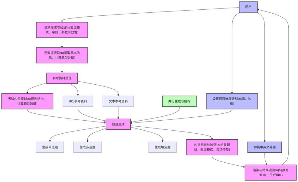 工作流程始于用户提交包含考试参数的请求,Demo 系统随即验证模块对请求格式、必要字段和参数有效性进行检查。验证通过后,元数据提取模块从请求中提取科目、年级、难度等关键信息,并处理用户提供的参考资料(URL 或文本)。内容规划模块根据提取的元数据制定考试结构方案,包括题型分布和数量分配。题目生成器接收规划方案后,并行处理同时生成单选题、多选题和填空题。内容组装模块负责将生成的题目整合为完整的考试内容,并进行格式验证和自动修复。最后,渲染服务将 Markdown 格式的考试内容转换为交互式 HTML 页面,用户可通过返回的链接访问考试内容并答题。