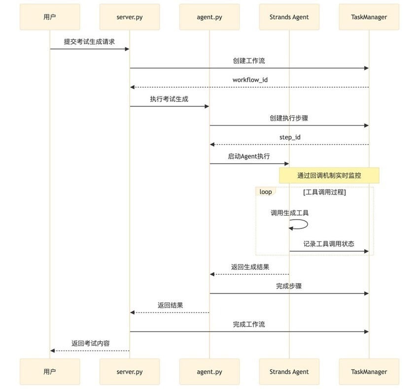基于以上这些功能设计,TaskManager 就像是考试生成系统的智能监控中心,它实时追踪每一次工具调用的执行情况。例如,当用户提交一个”生成一年级数学考试”的请求时,系统会依次调用多个工具——首先用 extract_exam_metadata 工具提取”一年级数学、10 道题、难度中等、单选为主”等元数据,然后用 plan_exam_content 工具规划考试结构,接着调用 generate_single_choice 工具生成具体题目,最后用 validate_exam_format 工具验证格式。TaskManager 会精确记录每个工具的开始时间、结束时间和执行结果,比如”元数据提取耗时 0.8 秒成功完成,内容规划耗时 1.2 秒成功完成,单选题生成耗时 3.5 秒成功完成”。如果某个工具执行失败,比如 generate_single_choice 工具因为网络问题超时,TaskManager 会立即标记这个状态并记录失败原因,帮助开发者快速定位问题。通过这些数据,我们可以了解哪些工具是性能瓶颈(比如题目生成工具平均耗时最长),哪些环节容易出错,从而指导产品优化方向,确保整个考试生成流程的稳定性和用户体验。