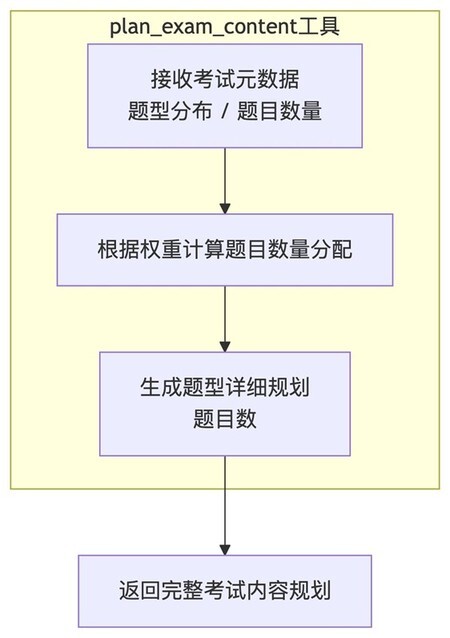 这个工具的输出将指导后续的题目生成过程,确保生成的考试内容结构合理。分数分配则是在前端 JavaScript 中实现的,而不是在 Python 工具中。