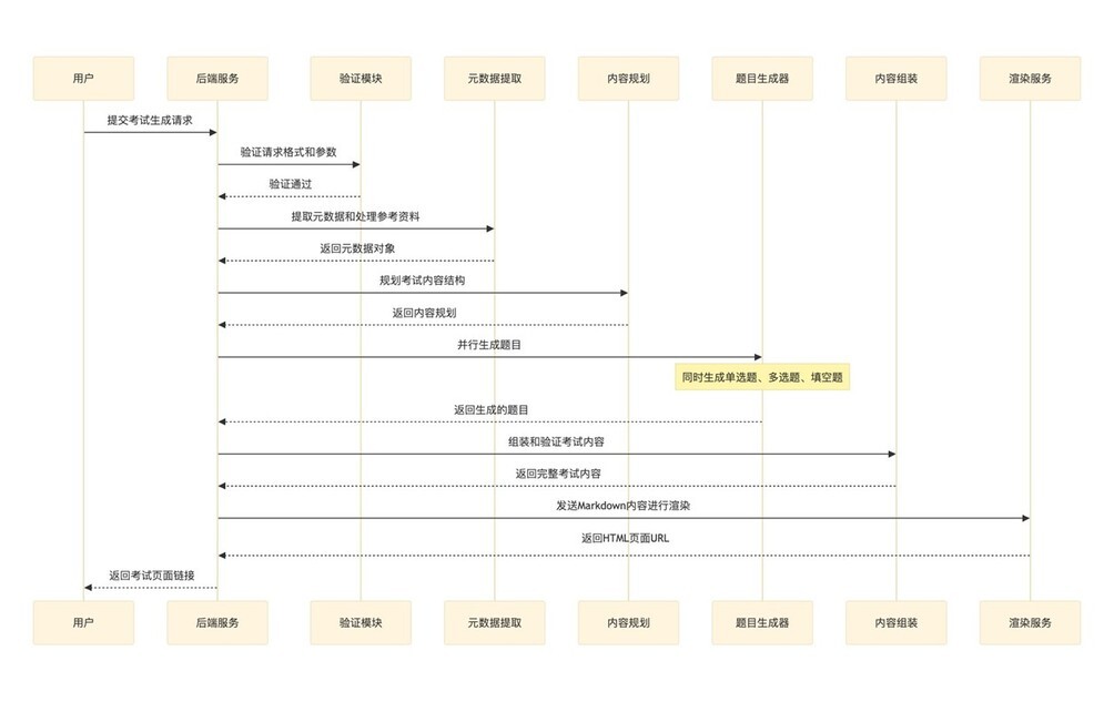 AI 考试生成器采用模块化的时序处理架构,通过各组件间的有序协作实现自动化考试生成。
