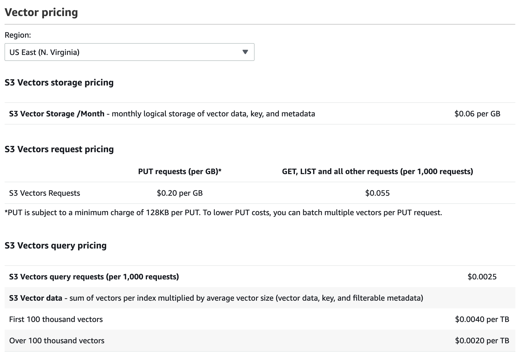 不过,S3 Vector 的按次计费模式在实际使用中也存在一定缺点。首先,PUT 请求(向量上传)费用较高,尤其在批量写入或频繁更新向量的场景下,这部分成本会显著增加。与传统自建或托管向量数据库不同,S3 Vector 每次上传操作都单独计费,导致在高频数据写入任务(如实时更新 Embedding)中成本不易控制。即使单次数据量很小,依然会产生 128KB 的最小费用。