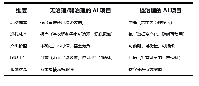 Ø 商业预期为何落空:一个直观的例子:例如,公司期望通过 AI 客服机器人提升客户满意度与解决效率。但如果投喂给它的历史对话数据充满未被标注的投诉、重复提问和错误解答(低质燃料),那么训练出的机器人就会学会重复这些低效甚至激怒客户的模式。上线后,它不仅无法达成提升满意度的预期目标,反而可能导致客户体验降级,与投资初衷完全背道而驰。