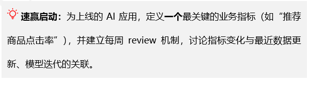 建立闭环,持续迭代:63%的高 AI 成熟度企业已制定指标,通过定期量化 AI 项目效益并利用多维度评估来持续改进。建立从模型输出到业务反馈,再到数据修正和模型再训练的持续迭代闭环,让 AB 两点在动态中不断靠近。