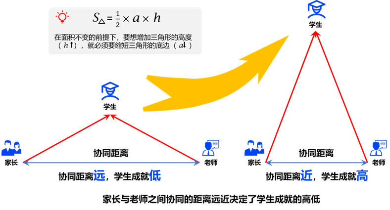 在一次普通的家长会上,老师指着白板上的一个三角形说道:“学生的成绩(顶点),取决于家长和老师(两个底角)的协同距离。我们彼此靠得越近,孩子的未来就站得越高。”如果我们将学生个人因素等同于三角形的面积,那么在三角形面积(个人因素)不变的前提下,要想增加三角形的高度(学生成绩),就必须要缩短三角形的底边(家长和老师的协同距离)。