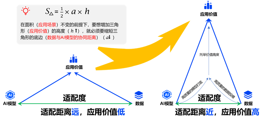 统一共识,诊断评估:用这个简单的三角模型在企业内部沟通,并客观测量数据质量状态(A 点)与模型领域化水平(B 点)之间的“协同距离”。