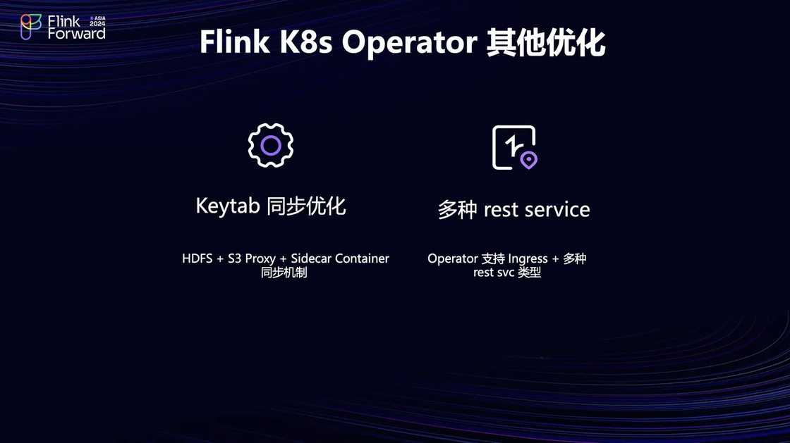 对 Operator 除了内存方面的优化,还做了一些其他优化,比如 Kerberos keytab 文件的同步优化。之前一般是把 keytab 文件同步到宿主机再挂载到 Operator 容器里,在作业启动的时候使用。但在混合云场景下要把文件同步到外部宿主存在很多限制,也有安全风险,所以基于 HDFS + S3 Proxy + Sidecar Container 的方式做了优化。