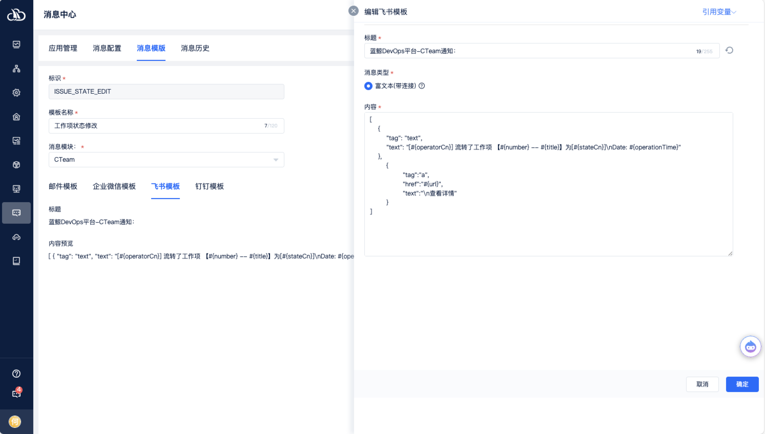 管理员可基于系统内置模板,灵活调整邮件和即时通讯工具的消息内容与格式,支持通过系统提供的引用变量(如 ${工作项名称} ${处理人} ${项目名称})个性化消息通知内容,让通知更贴合企业场景。