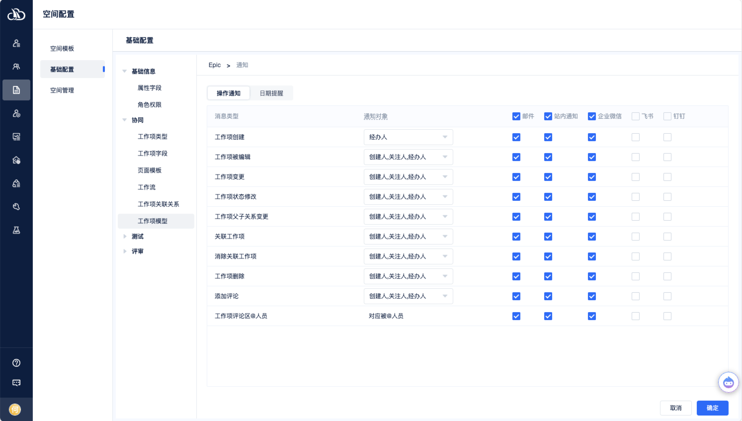部分产品模块支持按项目或全局配置通知规则:可指定哪些消息类型(如工作项变更、工作项评论区 @人员)需要通知,明确通知对象(如经办人、关注人)或角色(如需求人员、PMO),并选择对应的通知方式(站内信 + 企业微信 / 仅邮件等)。