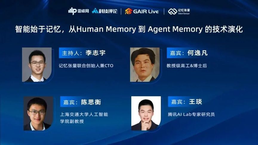近日,雷峰网联合记忆张量主办了一场主题为《智能始于记忆:Agent Memory 的技术演化过程》的线上圆桌论坛,邀请到了金融行业的资深领域专家何逸凡、腾讯 AI Lab 专家研究员王琰、上海交通大学人工智能学院副教授陈思衡三位重量级嘉宾,他们与主持人记忆张量 CTO 李志宇一起,围绕记忆的本质定义、与传统技术的区别、系统架构的瓶颈,以及未来在金融、教育、游戏等领域的商业化范式,展开了系统性的探讨。