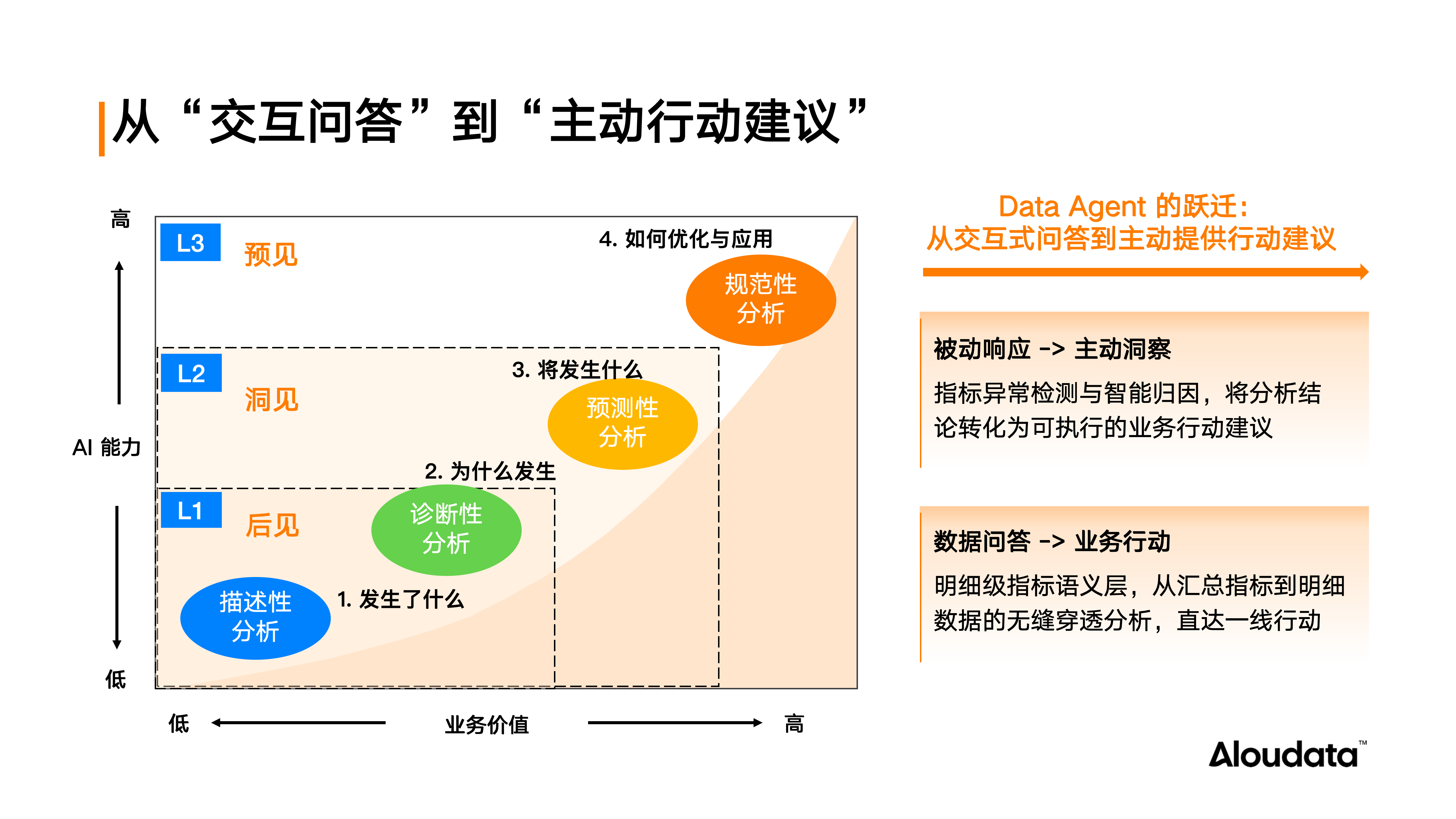 当前智能问数多处于 L2 阶段——回答“发生了什么”“为什么发生”。但更重要的价值在于 L3:主动预见问题并驱动业务行动。