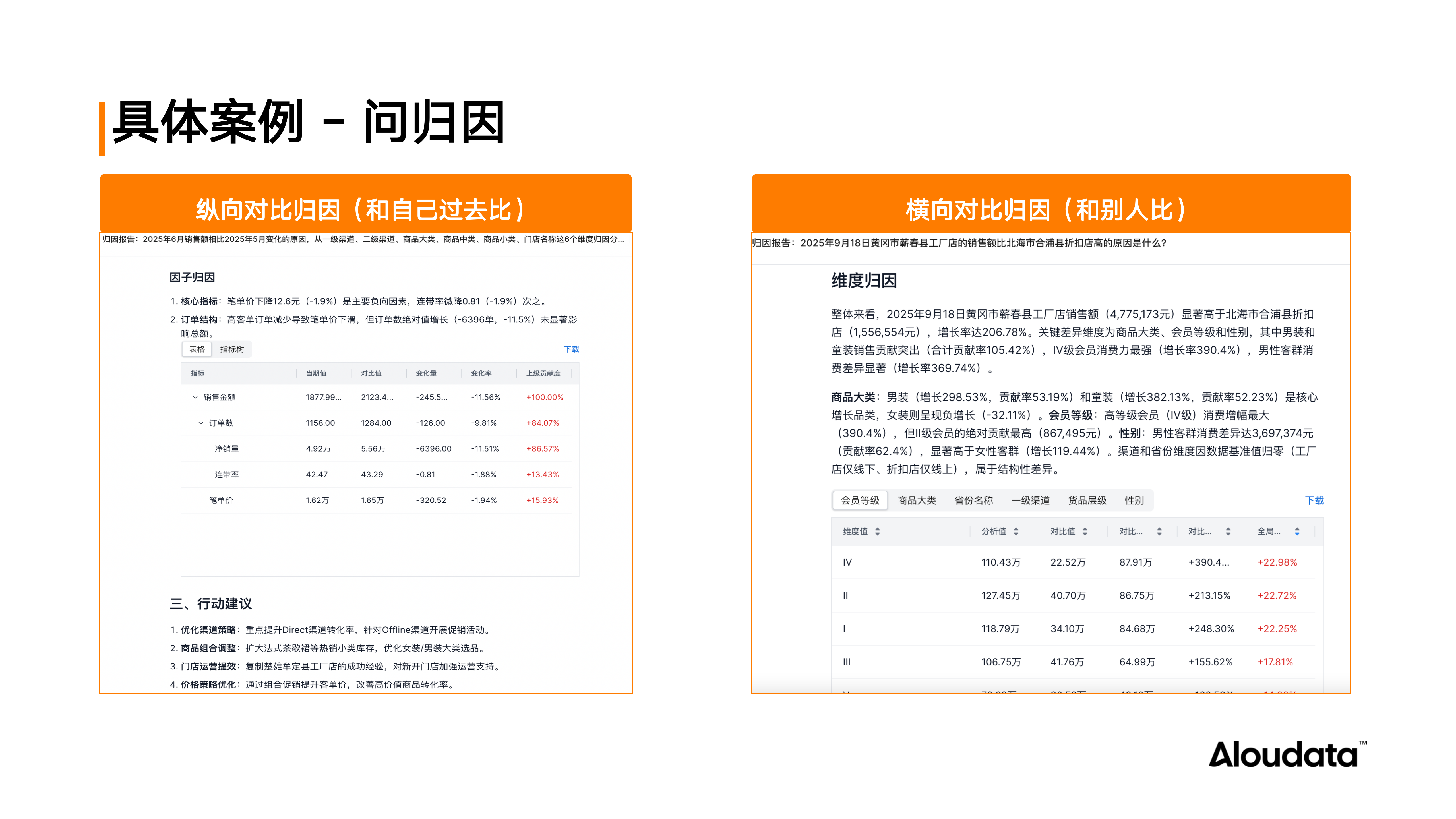 纵向对比归因:支持维度归因和指标因子归因。可从维度下钻拆解,分析销售额变动受哪些渠道、门店、品牌……影响;也可从指标和指标关系角度,分析销售额变动是单价上升还是销量增加所致。