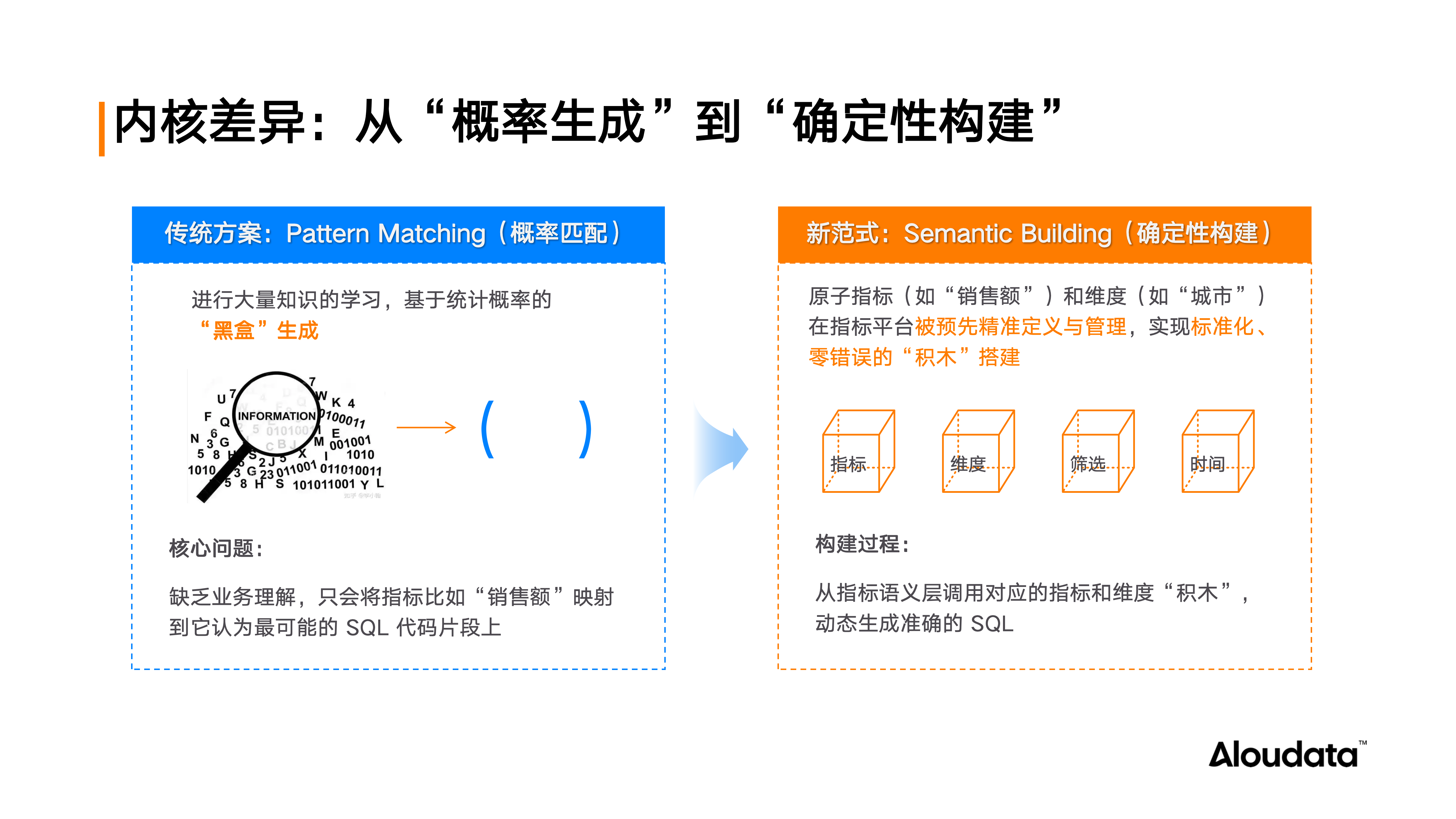 第二,生成的“随机性” VS. 决策的“确定性”。业务决策依赖稳定、一致的数据结果,但大模型本质上是概率生成模型,同一问题在不同时间或上下文中可能产生不同输出。这种“随机性”与企业对数据“唯一真相”的诉求天然相悖。