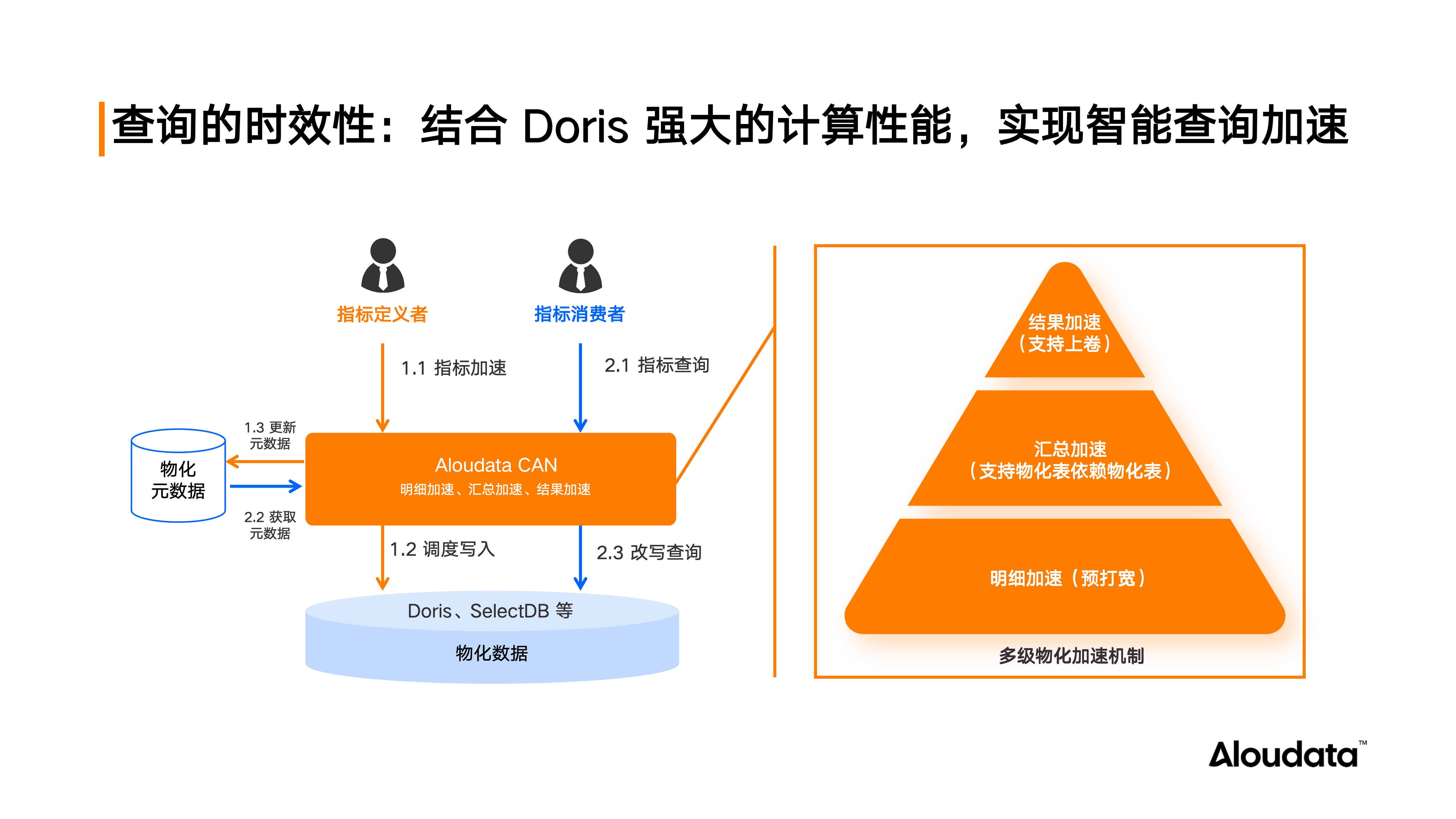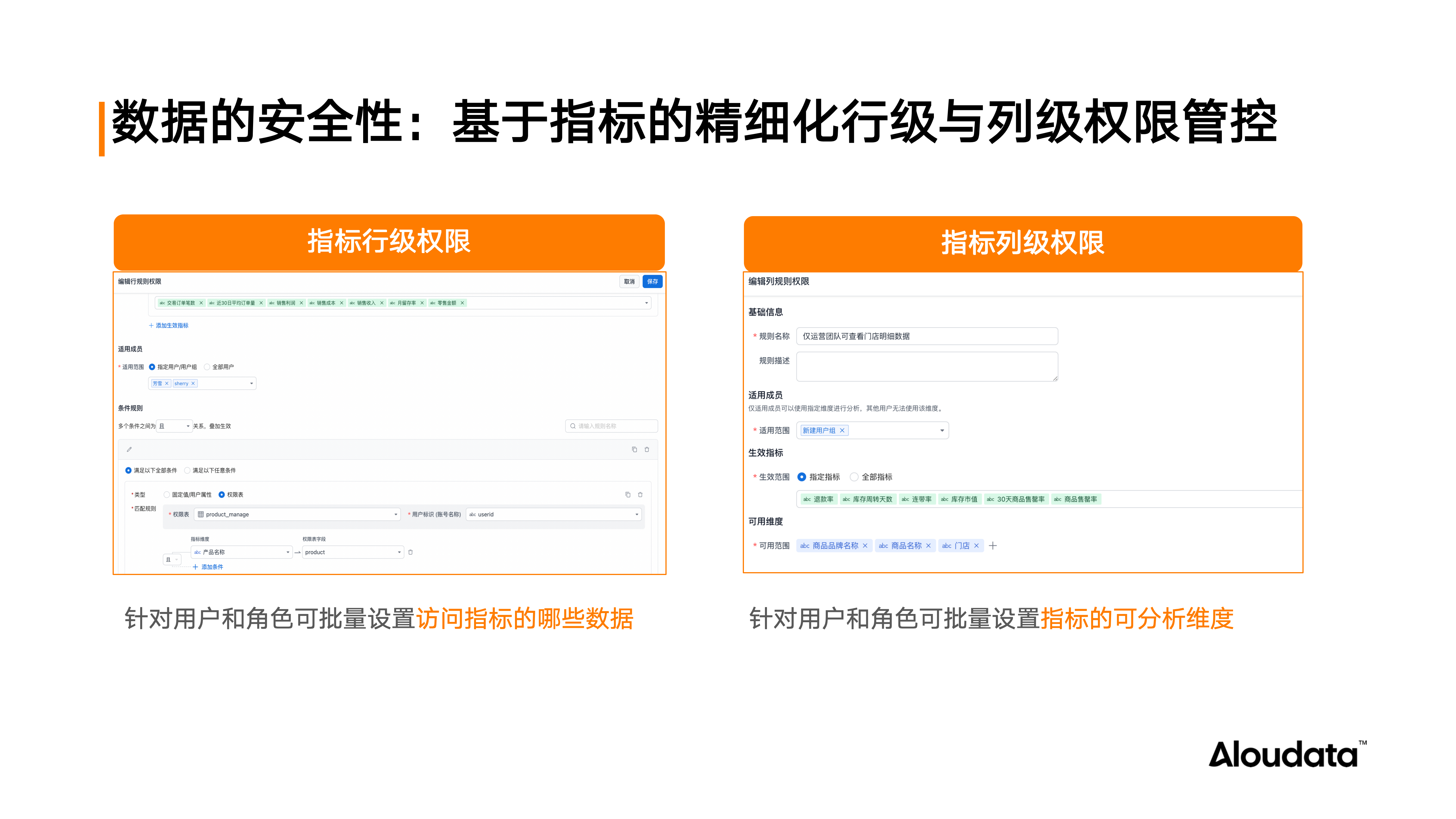 除上述三点外,Aloudata Agent 的 NoETL 指标语义层还提供底层基本保障。一是数据安全性:支持在指标语义层针对用户和角色设置行列级权限,确保所有数据查询结果不越权,这是智能问数开放给业务人员使用的前提条件。二是查询时效性:结合数据领域的二八原则,构建多级物化加速,确保用户频繁查询的指标和维度组合通过查询改写命中提前预计算好的物化表。若用户需查看明细数据,如订单量背后的具体大额订单及购买商品,平台也支持查询下钻,保证查询性能。
