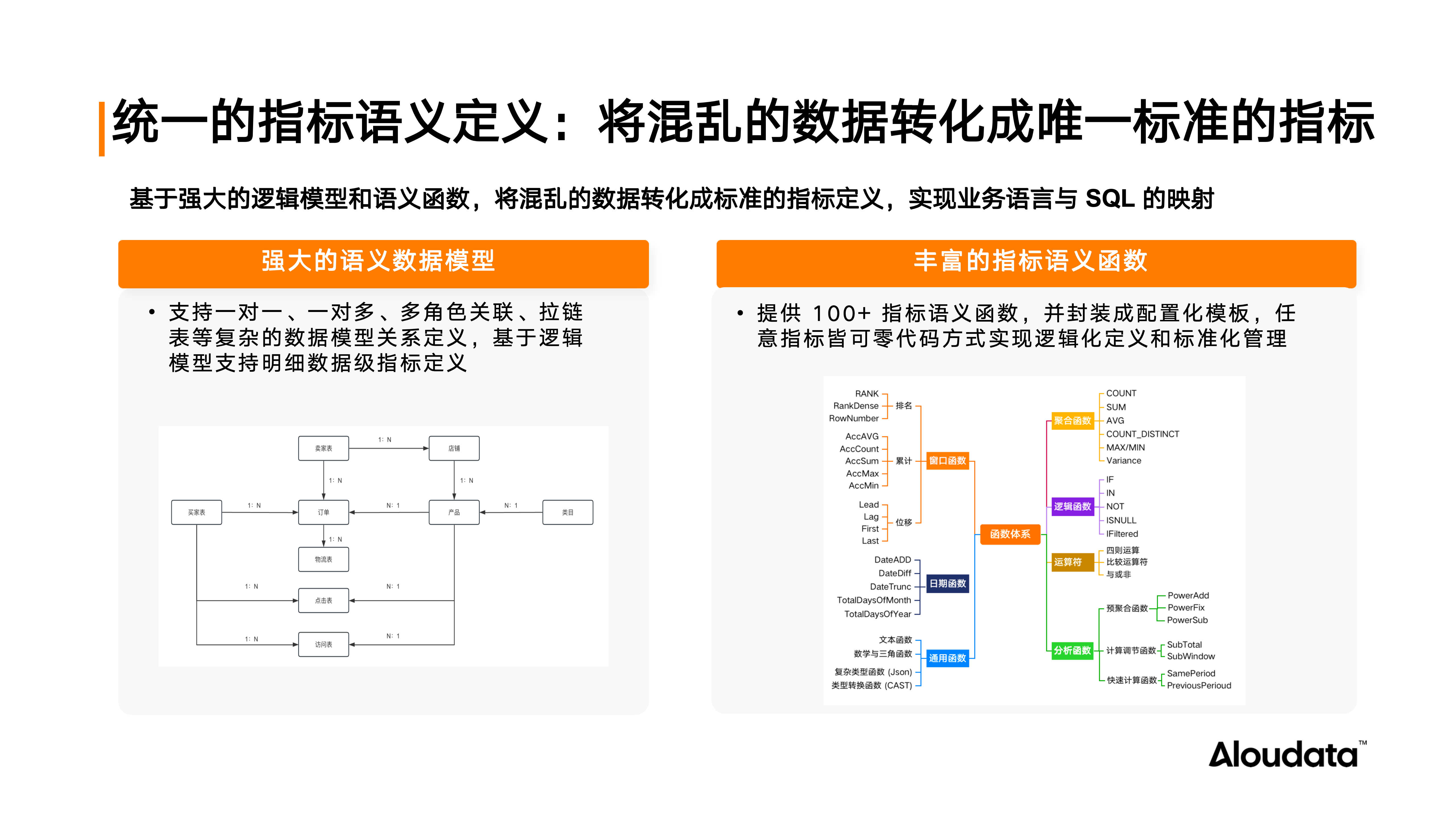 基于强大的逻辑模型和语义函数,将混乱的数据转化成标准的指标定义,实现业务语言与 SQL 的映射。