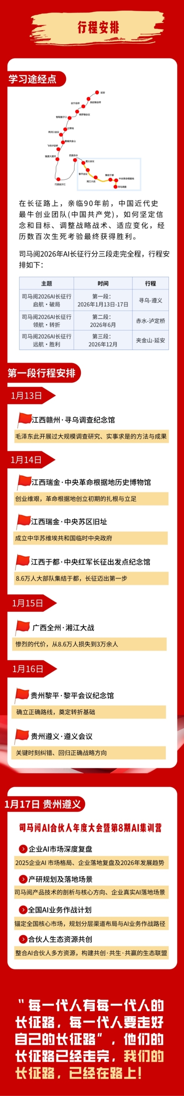 去年年底,司马阅团队重走长征路,堪称热血征途,团队自驾穿越六省,在 23 个红色地标中汲取“最牛创业团队” 的战略智慧,从先辈们穿越绝境、突破封锁、重建方向的壮阔征程中汲取了真正的精神力量。更通过 AI 实战分享,让伙伴们实现从“懂 AI”到“用 AI”的跨越。