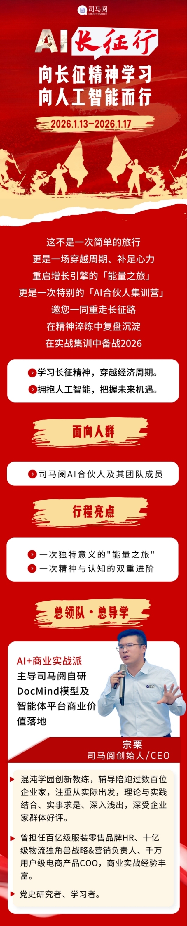 这不是一次简单的旅行,而是一场穿越周期、补足心力、重启增长引擎的「能量之旅」,更是一次特别的「AI 合伙人集训营」,邀您一同重走长征路,在精神淬炼中复盘沉淀,在实战集训中备战 2026!