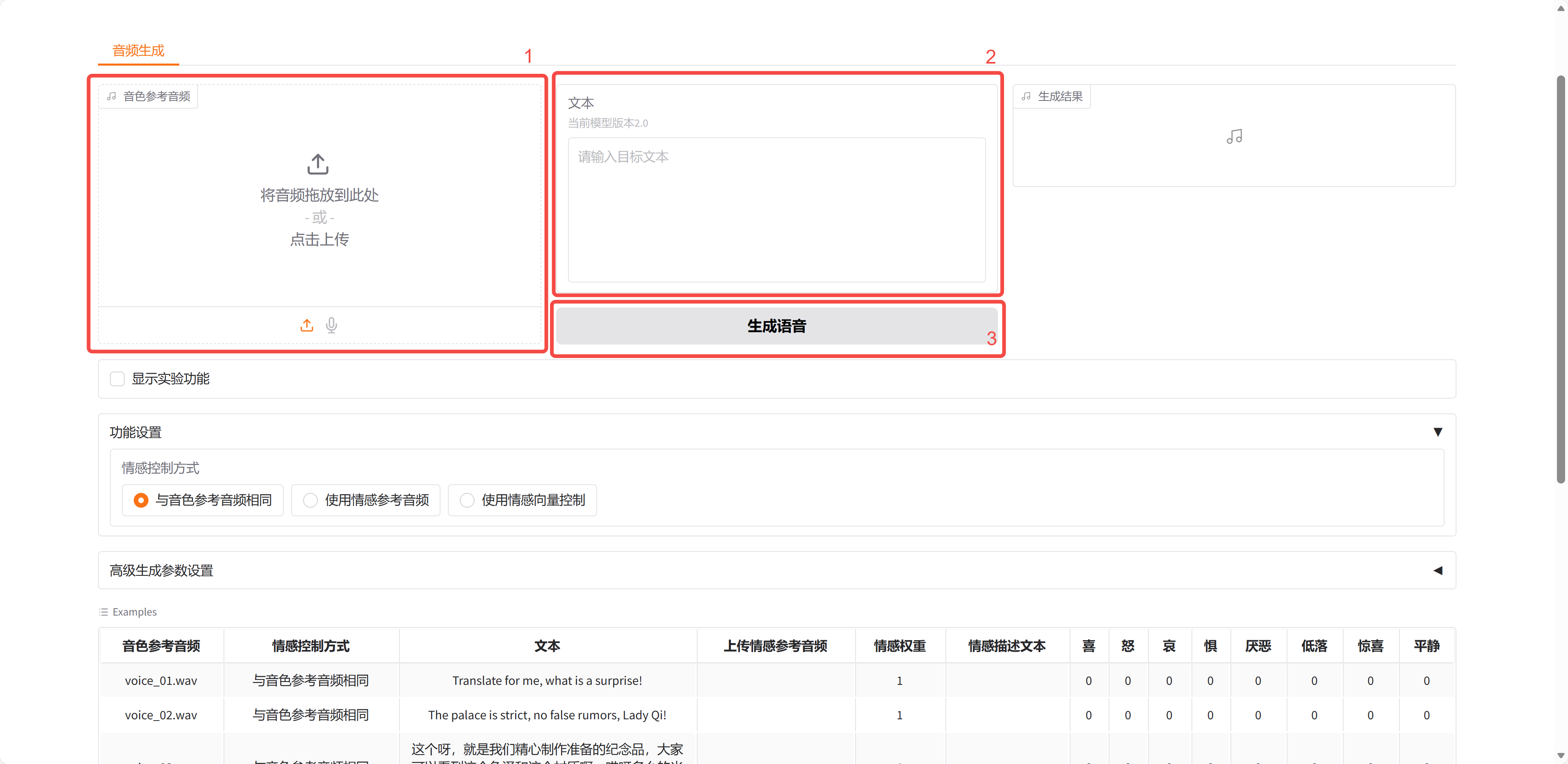 上传音色:传一个几秒钟的 MP3(比如姜文老师的语音)作为参考音频。如果没有,可以用系统自带的。