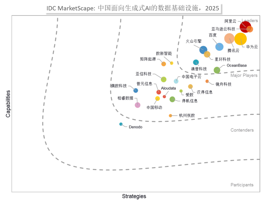 《IDC MarketScape: 中国面向生成式 AI 的数据基础设施 2025 年厂商评估》报告从产品能力、战略指标和收入规模三大核心维度评估了 24 家互联网厂商、云服务厂商、大数据厂商。结果显示,阿里云位居领导者类别。