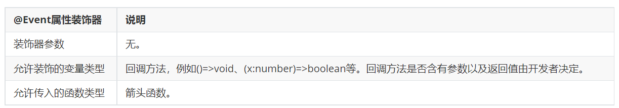 @Param 标志着组件的输入,表明该变量受父组件影响,而 @Event 标志着组件的输出,可以通过该方法影响父组件。使用 @Event 装饰回调方法是一种规范,表明该回调作为自定义组件的输出。父组件需要判断是否提供对应方法用于子组件更改 @Param 变量的数据源。