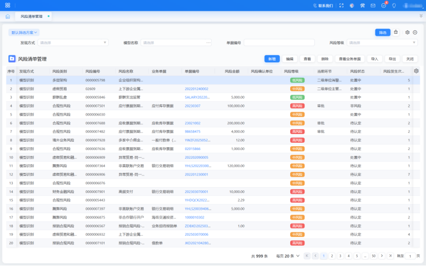 “风险监管中心”看板直观呈现全企业风险数据,支持按模型场景、风险等级展示,管理层一眼掌握整体态势;更支持“穿透下钻”,从风险预警信息点击即可直达关联的业务单据,无需跨系统查询,快速追溯风险源头,解决传统监管“数据分散、查不清、追不明”的难题。