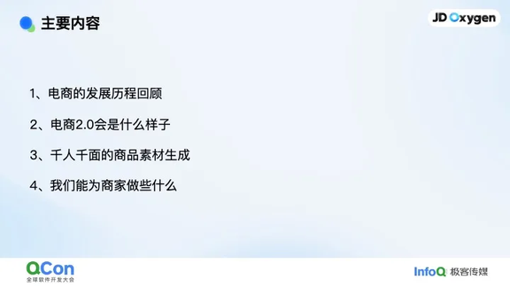 这是我今天要分享的内容提纲,我会先和大家一起回顾一下电商的发展历程,然后给出我认为的电商 2.0 时代的几个典型特点,接着会在“千人千面”的商品素材生成这里展开详细讨论,最后给大家分享 AIGC 技术能为广大电商商家做些什么。接下来我们进入第一部分。