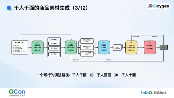 “千人千面”的搜索推荐,在这个时代大家肯定不陌生了,但是真正意义下“千人千面”的商品素材,其实作为消费者大家体感并不强烈,这也是整个电商行业和京东正在努力突破的技术产品方向之一。这个例子就非常典型,同样的一件冲锋衣,不同类型的买家关注点完全不一样。比如最左边的“户外功能需求型买家”,Ta 所关注的是功能型指标,例如防风性、防水性、面料科技等等,中间的“颜控型买家”,Ta 更多的则是关注服装本身的美观度、设计风格、以及与其他服装的搭配效果,所以商卡会呈现出较多 OOTD 相关的内容,也是一类非常典型的买家;最右边的买家同样典型,是“价格敏感型”,会关注促销活动、赠品、价格是否为全网最低价,所以商卡的呈现一直在 highlight 优惠相关的信息。通过解释这三个 case,大家应该也清楚了什么叫“千人千面”的商品素材。接下来,我就和大家分享如何从技术上去实现这一套业务框架。