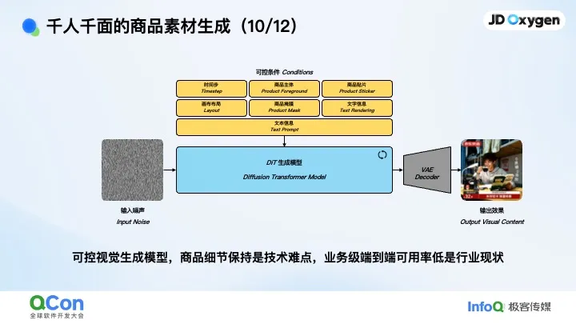 第二个我们要详细介绍的模型是可控视觉生成模型,这是一个基于多条件的扩散模型,上面黄色部分都是模型的可控条件,这里除了扩散模型所必须的 Timestep 和文本 Prompt 外,商品主体、文字、布局 Layout、贴片都是可以作为可控条件输入的,不过之所以是大家现在看到的框架,本质原因还是生成模型的文本指令跟随能力较弱,未来我们会看到不同类型的可控条件都可以统一到一个自然语言描述的文本空间,同时理解模型也会和生成模型实现架构上的紧耦合。但是,站在业务的角度来看,电商领域的可控生成是所有领域中要求最高的,也是最严肃的场景,任何商品信息的改变都会引发非常严重的业务后果,所以到目前为止业务级端到端的素材生成可用率也是比较低的,这是行业现状。