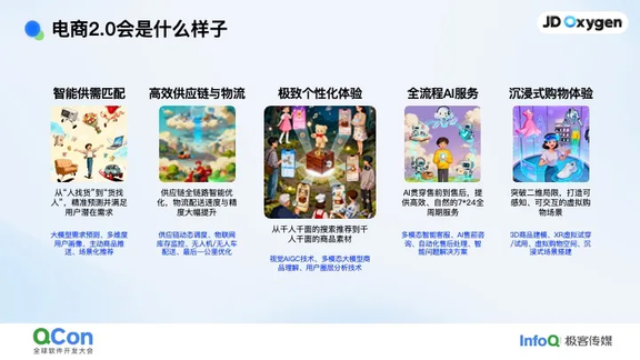 商品贸易的起源其实可以追溯到很早,据考证公元前 7000 年就已经出现了商品交易的雏形,但今天我们仅聚焦过去的一百年就好,20 世纪 60 年代以前,我们所有的交易都是发生在线下的,因为那个时期还没有真正意义的计算机出现,甚至 60 年代还经常可以看到一部分的物物交换。后来随着计算机技术的发展,EDP/EDI 技术的出现,电子商务正式进入了萌芽阶段。后面的故事,有很多大家都比较清楚了,上个世纪 90 年代出现了因特网,也正是在那个时期诞生了亚马逊、京东、阿里巴巴这样的线上交易平台。2005 年之后,伴随着移动互联网的浪潮,货架电商、内容电商纷纷展露出自己的竞争力,大家对流量的争夺也逐步进入了白热化,这个时期也出现了“千人千面”的搜索推荐,保守一些,我们姑且把这一阶段定义为电商的 1.0 时代。2022 年是不同寻常的一年,这一年年底出现了 ChatGPT,出现了 Midjourney,在大模型、具身智能、3D/XR 等新技术的涌现下,电商正式迈进了它的 2.0 时代,那么这个时代的电商会有什么体验和效率方面的进化呢,接下来我分享一下自己的理解。
