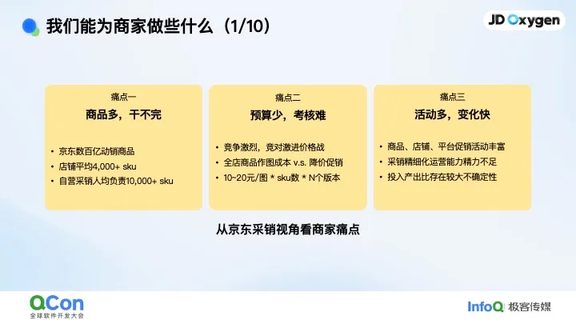 首先,我们从京东采销的视角来看看商家有着什么样的痛点。第一,商品多,活干不完,大家知道在京东我们有数百亿的动销商品,店铺平均 sku 达 4000 以上,以自营采销为例,平均每人要处理上万的 sku。第二,预算少,考核难,大家知道各个电商平台都在激进的进行价格战,在这个大背景下,全店铺商品的素材制作成本也是一笔不容忽视的成本开销。第三,活动多,变化快,商品、店铺、平台促销活动非常丰富,而采销精细化运营的能力其实是参差不齐的,且精力不足,因此在每个活动上的投入产出比具有非常大的不确定性。