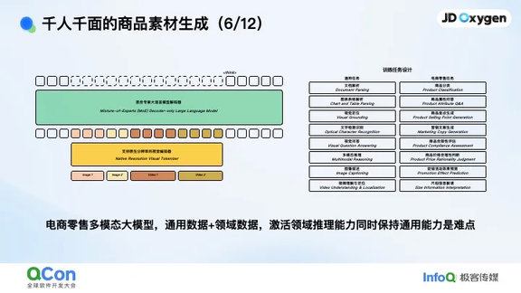 首先是电商零售多模态理解大模型,这个模型是一个经典的 Vision Language Model 的技术框架,可以看到不同的模态会通过专用的 Tokenizer 进行 Token 化,然后输入至一个 MoE 架构的 Decoder-only Large Language Model,这里面关键的技术难点不在于模型结构,而是如何在激活电商零售这个垂域推理能力的同时保持住原始模型的通用能力,所以右侧我们给大家分享了针对通用场景以及电商零售场景我们分别应该如何去设计训练任务以及如何收集训练数据。