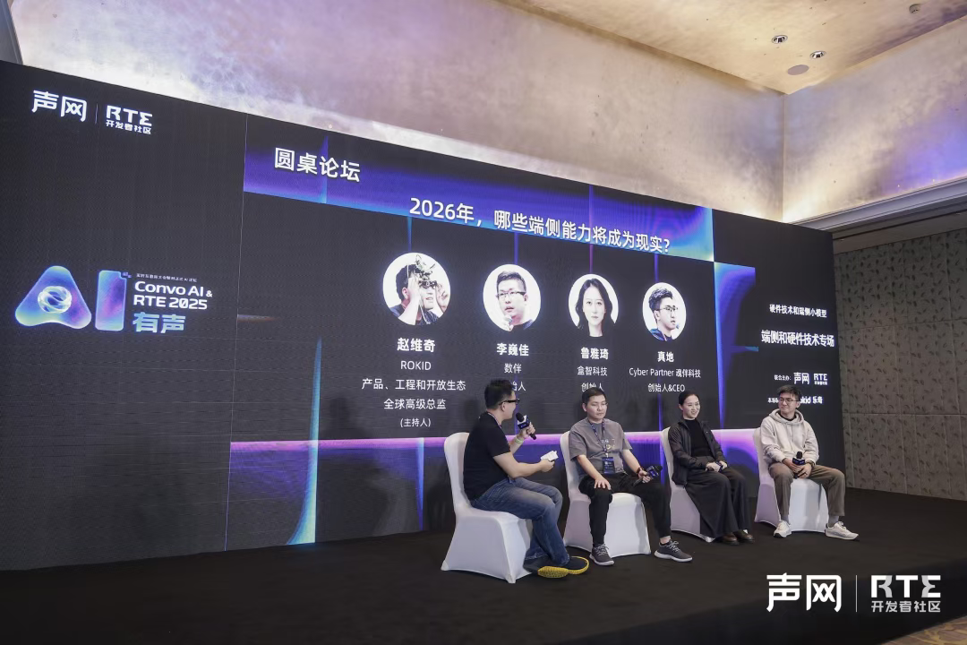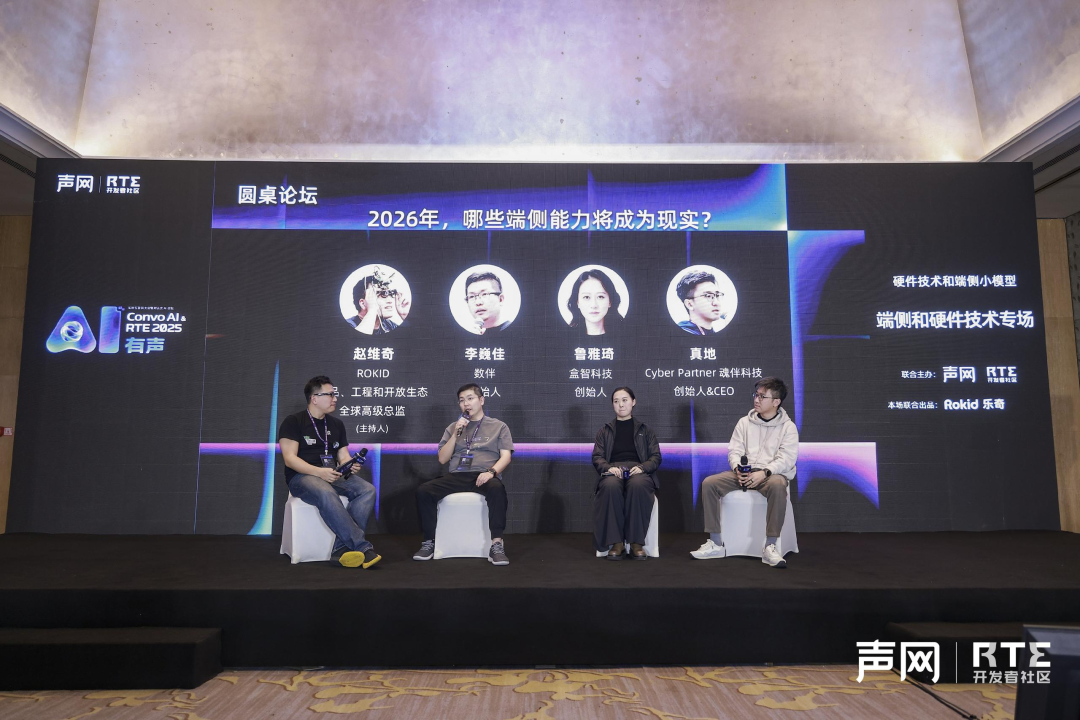 本次主题为「2026 年,哪些端侧能力将成为现实?」的圆桌讨论由 Rokid 全球创新产品、工程和开放生态负责人赵维奇主持,参与讨论的嘉宾有数伴创始人李巍佳、盒智科技创始人鲁雅琦、CyberPartner 魂伴科技创始人 &CEO 真地。