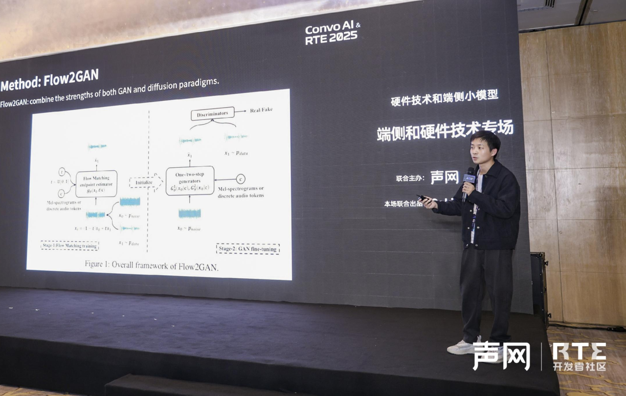 现有主流的 GAN 方案(如 BigVGAN)推理速度快但训练慢且不稳定,而 Diffusion 方案训练稳定但通常需要多步推理,计算代价高。姚增伟介绍的 Flow2GAN 声码器技术旨在从压缩音频特征中重建高质量音频波形,结合现有主流 GAN 方案(单步推理快但训练不稳定)和 Diffusion 方案(训练稳定但需多步推理、计算代价高)的优点,并针对性地调整了 Flow Matching 预训练阶段,以适应音频数据建模,并通过结合 GAN 策略进行细节优化,最终实现了单步或两步的高质量音频生成,确保了高保真度的同时,显著提升了推理速度和稳定性。