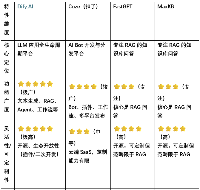 从上表可以看出,FastGPT 和 MaxKB 是解决特定问题(知识库问答)的“瑞士军刀”,Coze 是打造轻量级 Bot 的“快速通道”,而 Dify 则是一个功能完备的“武器库”。对于有长远 AI 规划的企业而言,Dify 的优势是战略性和结构性的。