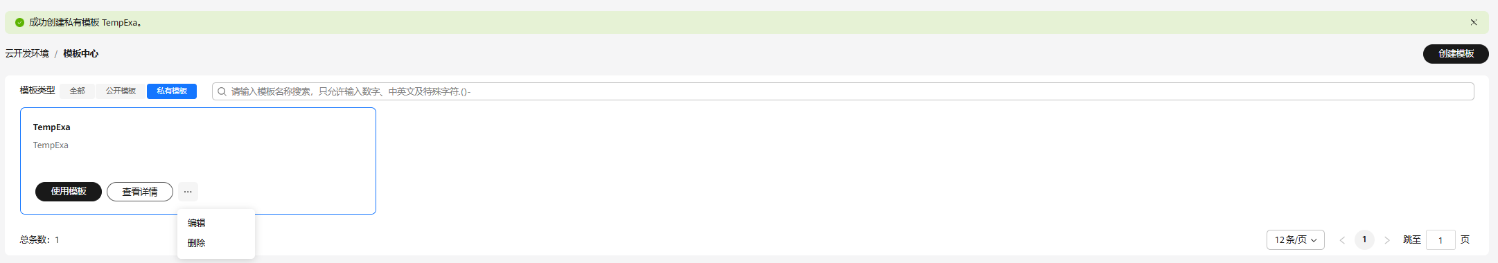 配置完成后,点创建模板,完成模板创建。可在模板中心 > 私有模板进行查看。鼠标悬停模板,可对模板进行使用模板、查看详情、编辑、删除等操作。