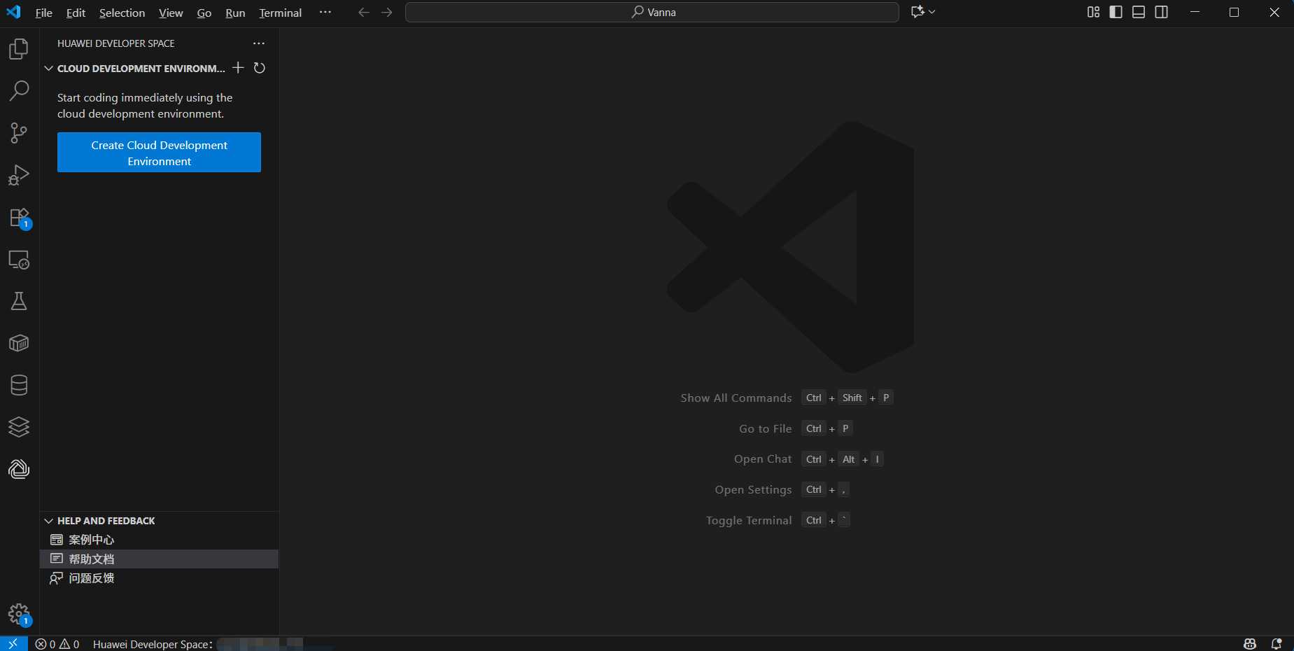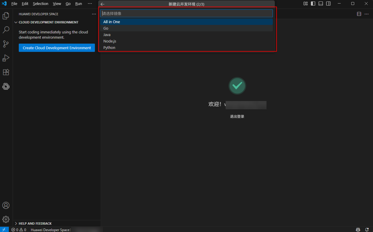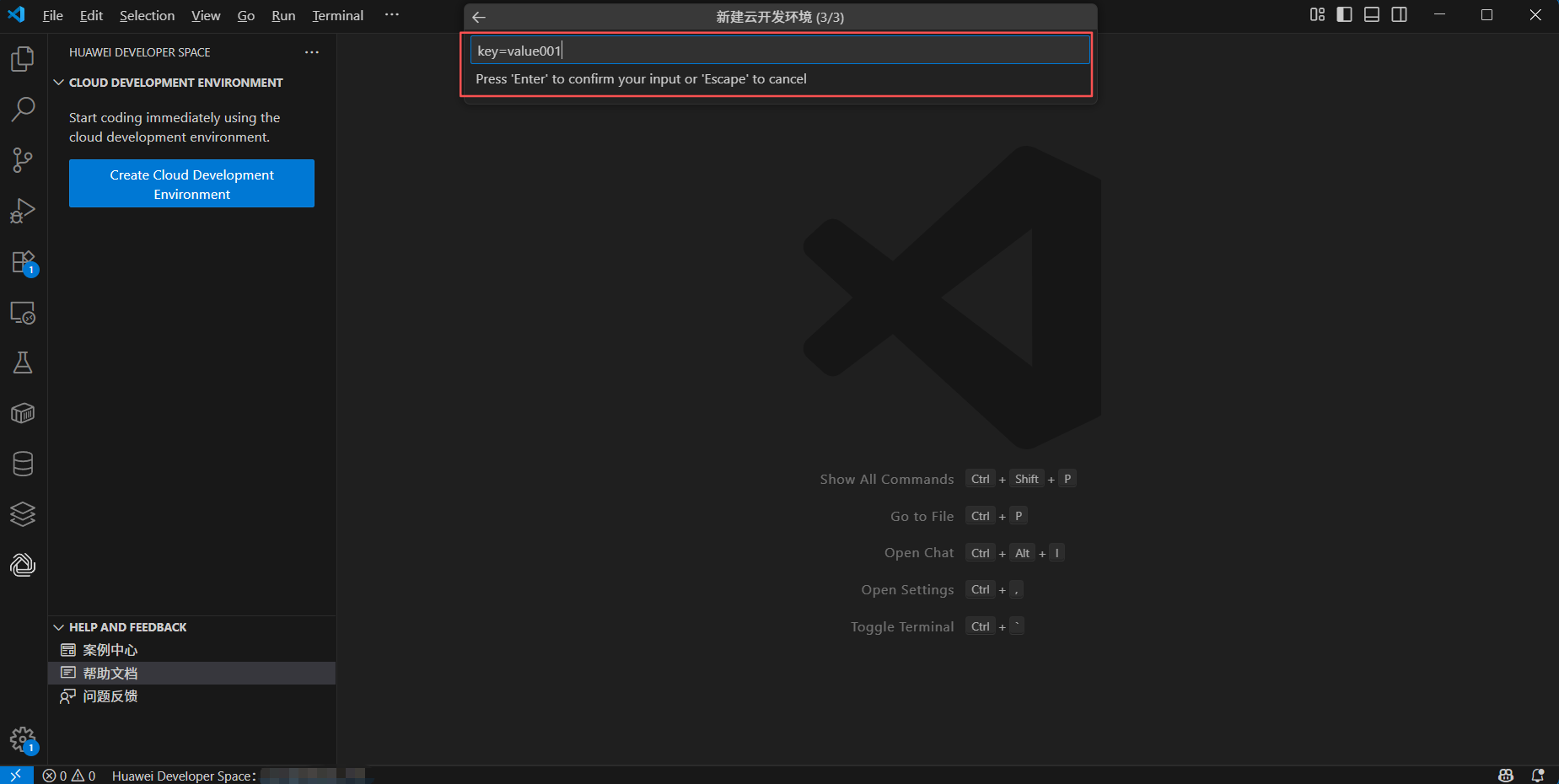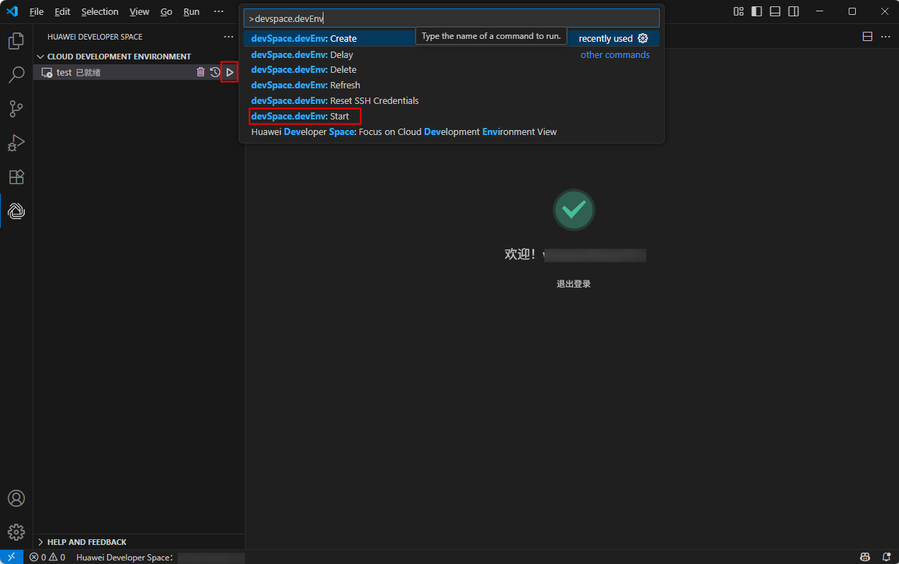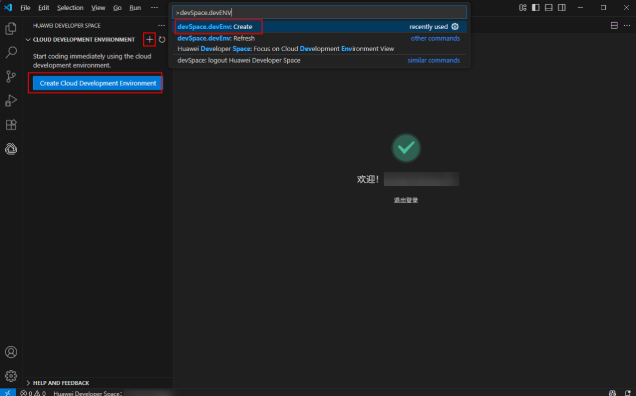 VS Code 中 Huawei Developer Space 插件的“**+”或者 Create Cloud Development Environment 按钮,或者通过快捷键 Ctrl+Shift+P**,在搜索框中的devSpace.devEnv:Create