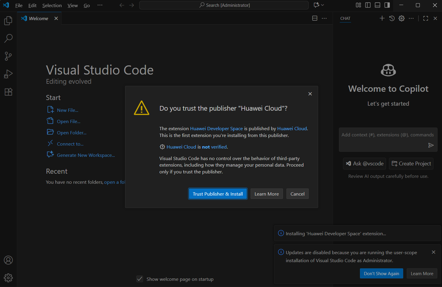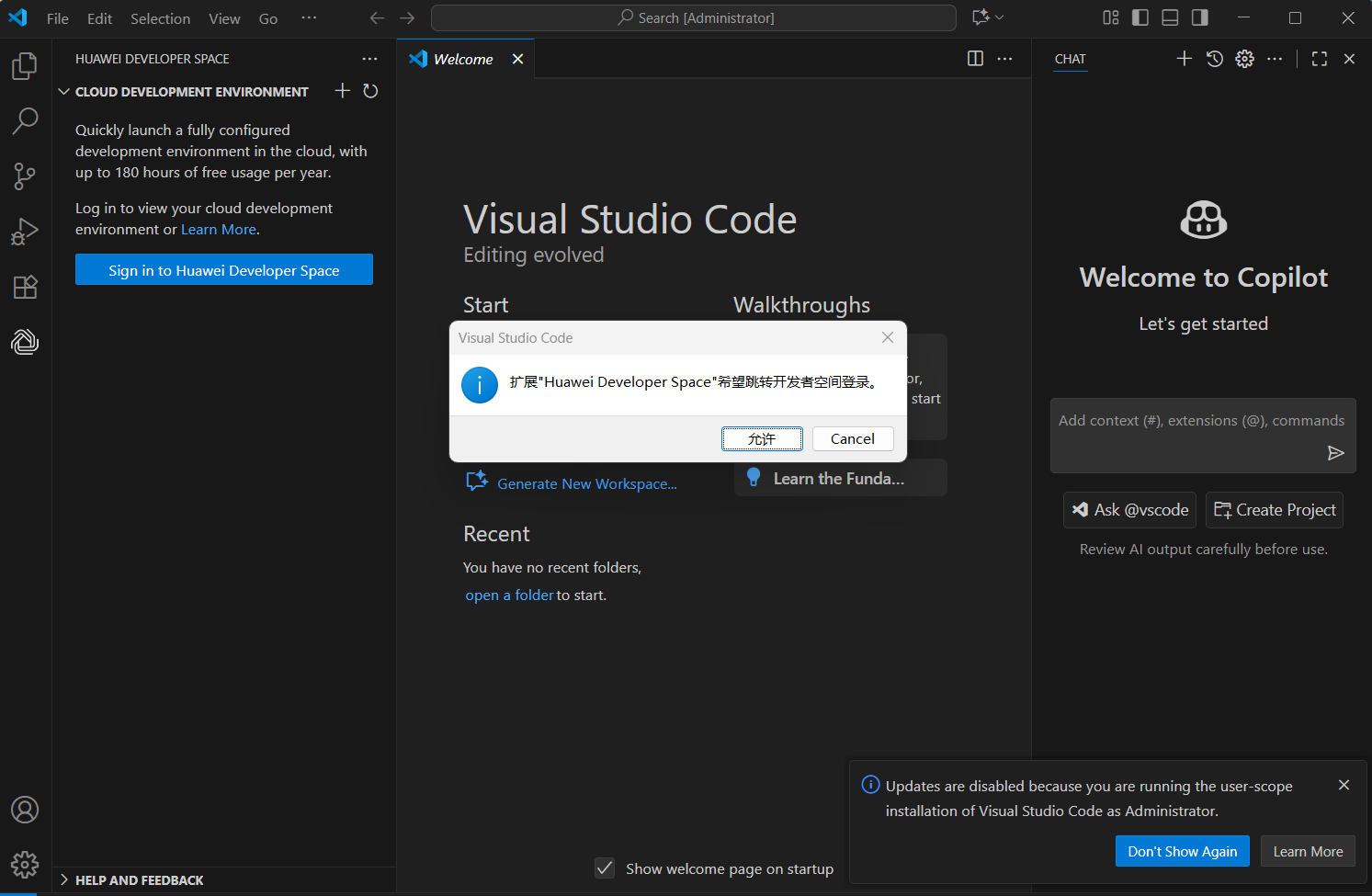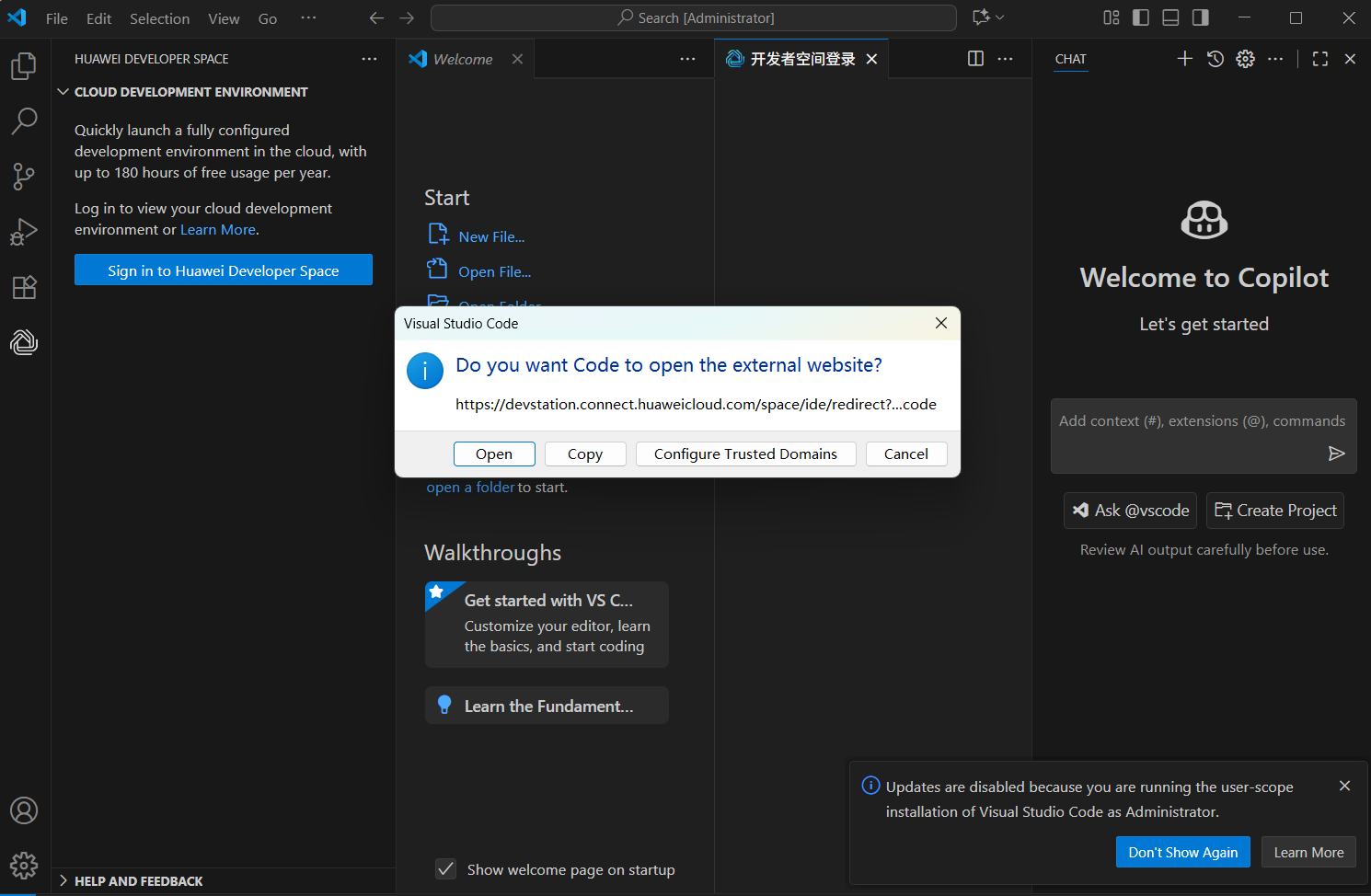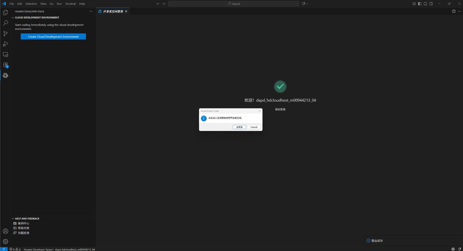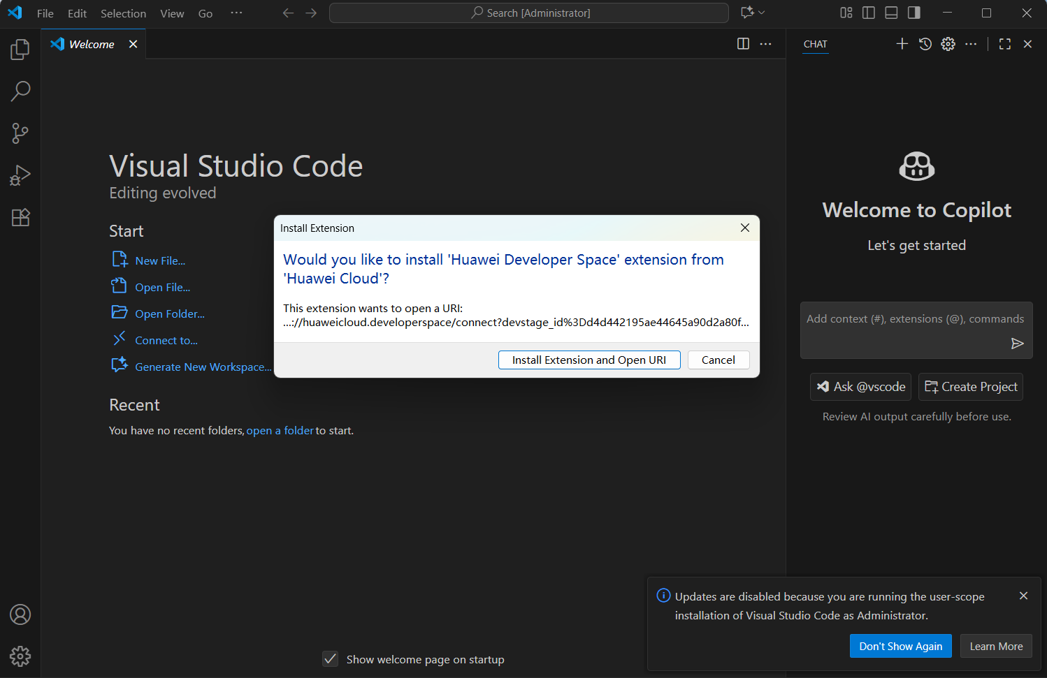 打开 VS Code 后,提示安装 Huawei Developer Space,点 Install Extension and Open URI。