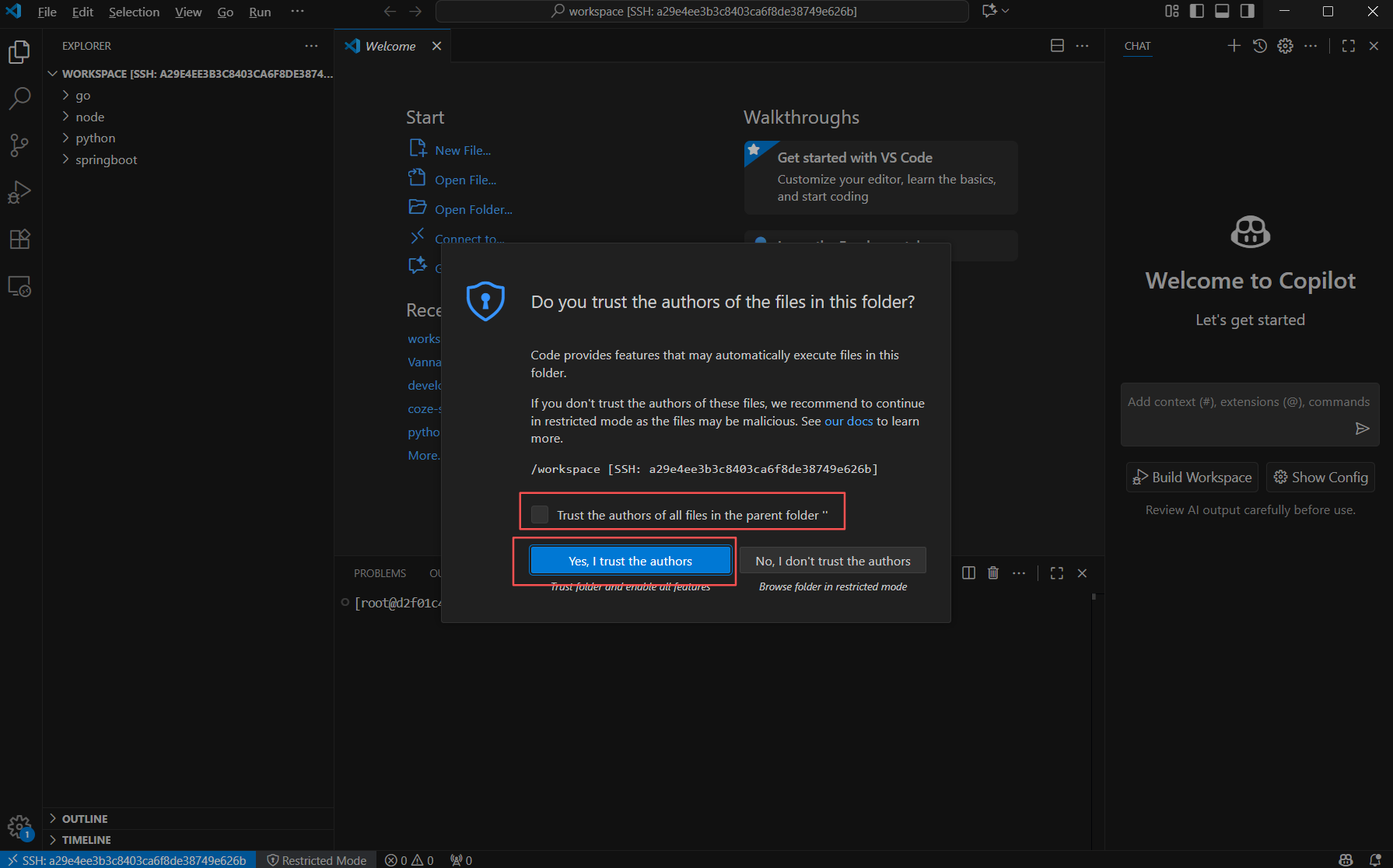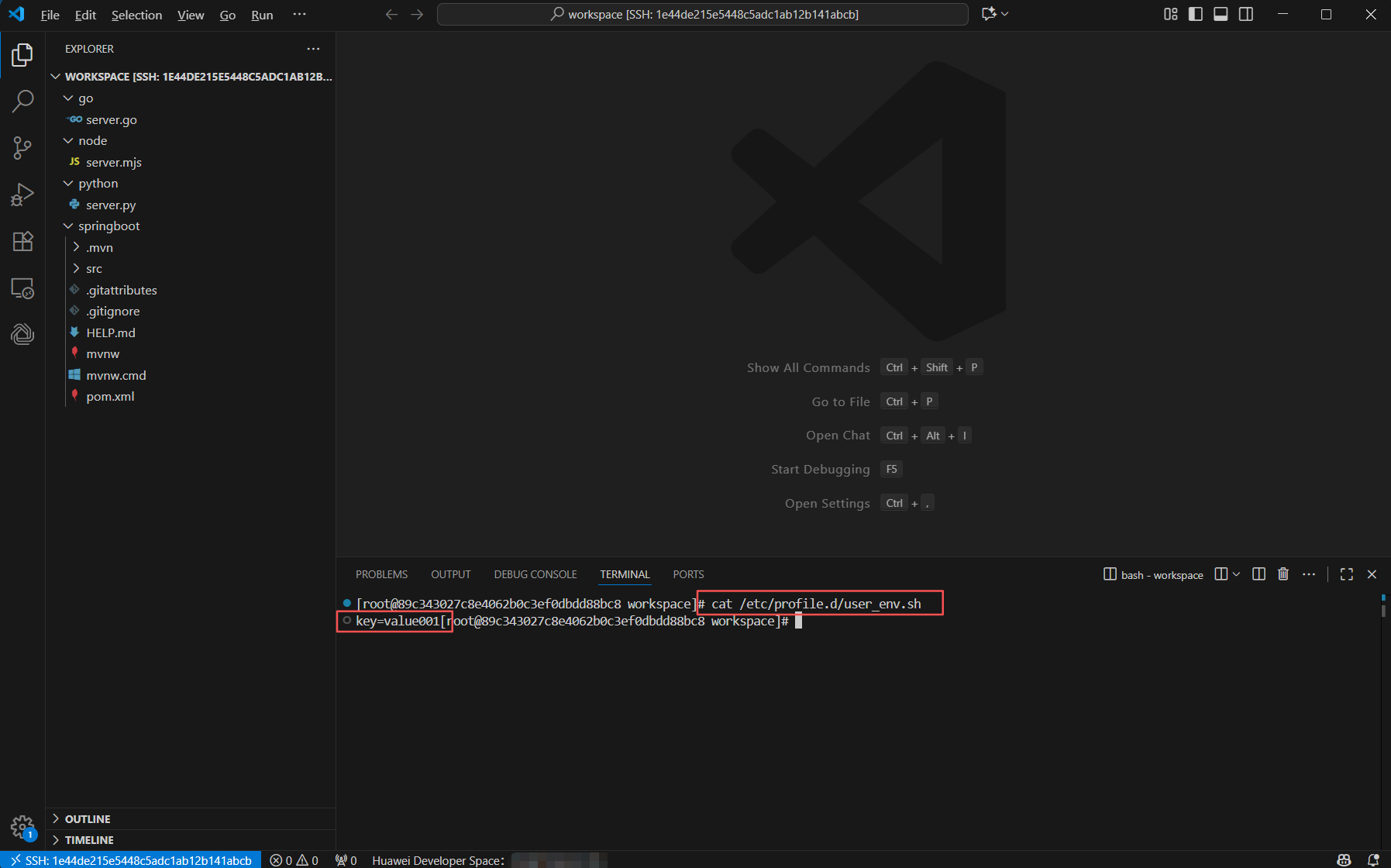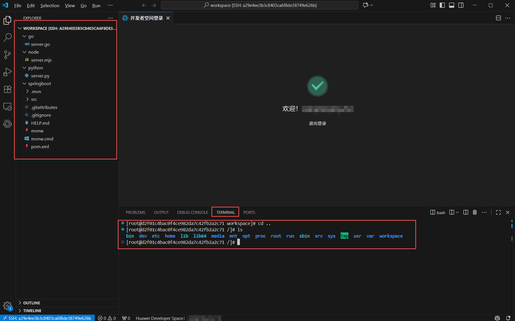 的 Remote SSH 连接被成功创建。在左侧 EXPLORER 栏查看镜像的预置内容,以及在下方的 TERMINAL 栏中对云开发环境(容器)test